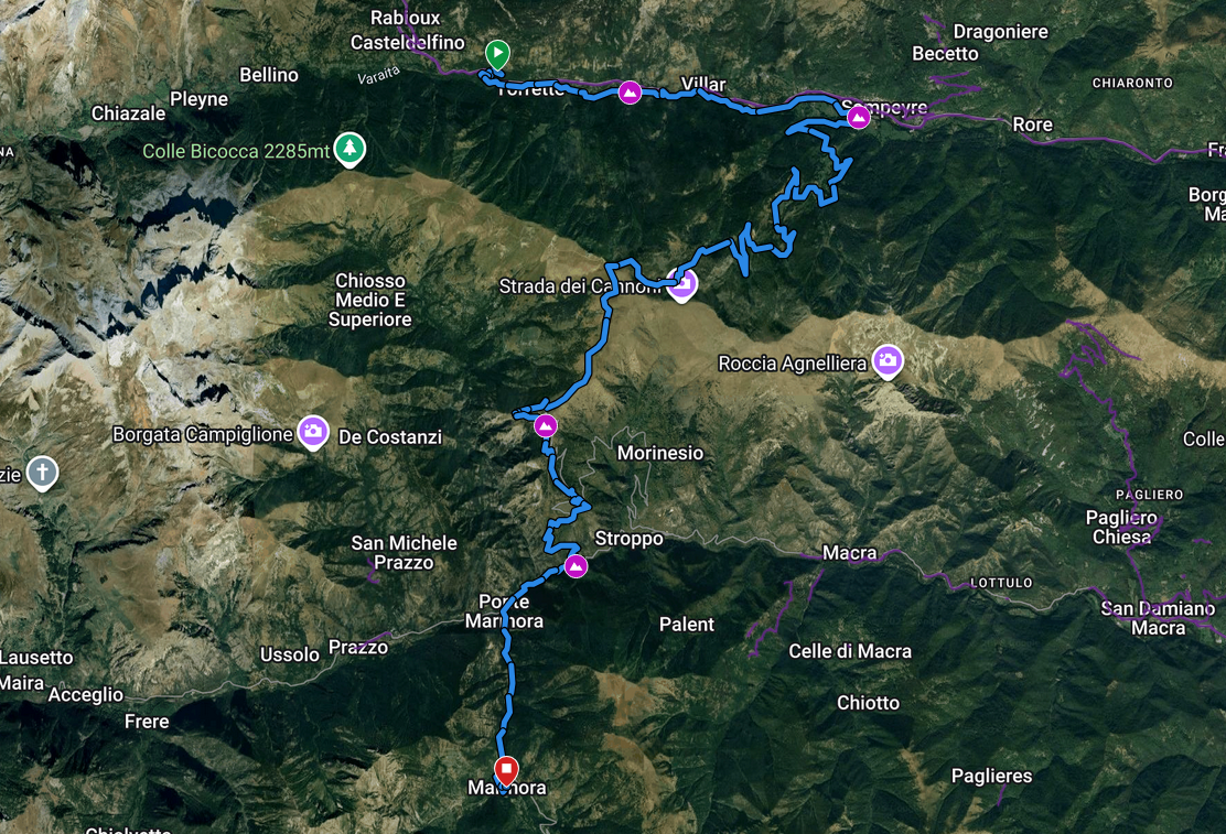 Oben angekommen, erwartet uns ein Panorama welches ihresgleichen sucht. Der Blick über die Gipfel des Valle Maira ist schlicht atemberaubend. Links von uns, führt die Strada dei Cannoni als Höhenstrasse kilometerlang der Bergflanke entlang.