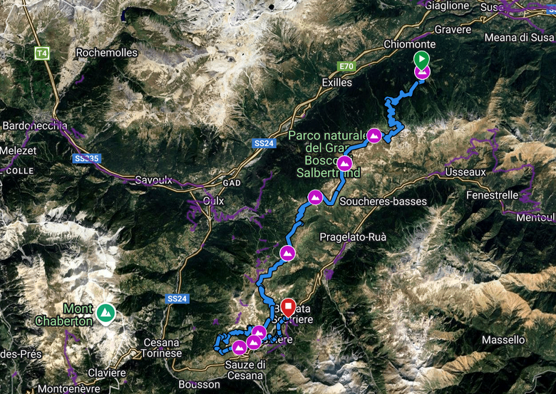 Die Strasse verläuft fast vollständig auf über 2400 Meter H.ü.M und führt entlang des Kamms, der das Val Chisone und das Val Susa trennt, und quert mehrere Bergpässe, welche die beiden Täler verbinden.