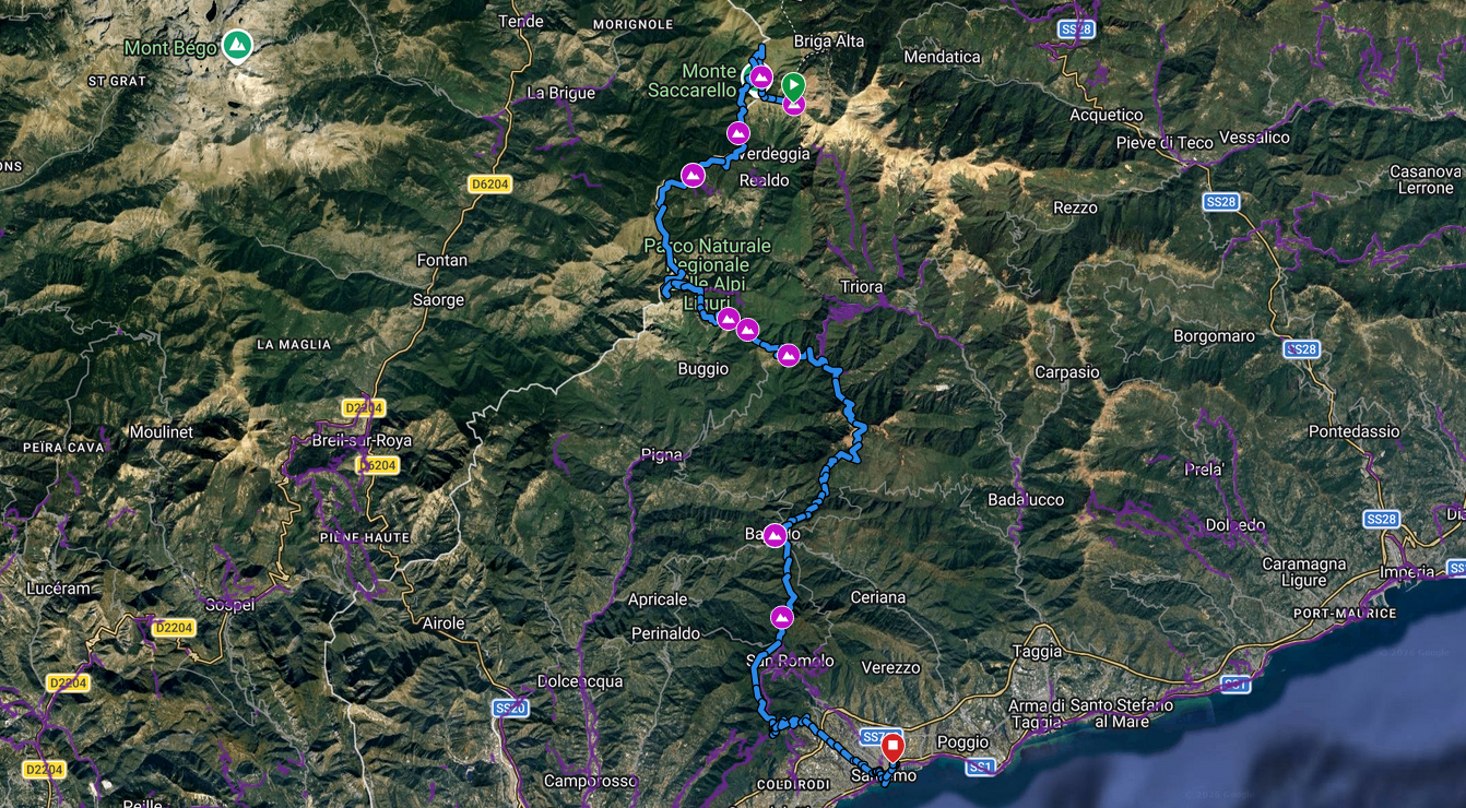 Die letzte Etappe auf unserem Weg von Fehraltorf nach San Remo. Im ersten Licht des Tages erspähen wir das Mittelmeer am Horizont. Unser Ziel! Wir geniessen die überwältigende Aussicht und stärken uns für unser letztes Teilstück. Doch der Schein trügt. Einfach nur noch runter ans Meer? Denkste! Erst mal gehts ziemlich steil hoch! Zurück zur Statue del Redentore unterhalb des Monte Sacarello.