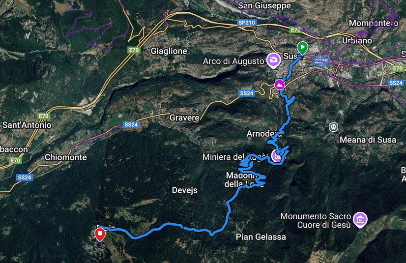 Wir starten in Susa, dem Endpunkt der letztjährigen Transalp. Kurz nach der Stadtgrenze, beginnt der stetige Aufstieg zu unserem Übernachtungsort nach Frais. Der Blick zurück bringt, immer wieder, spektakuläre Ausblicke ins Valle di Susa. Im kleinen Dorf Frais, beziehen wir Quartier und freuen uns auf den morgigen ersten Höhepunkt der diesjährigen Tour, die Strada dell'Assietta.