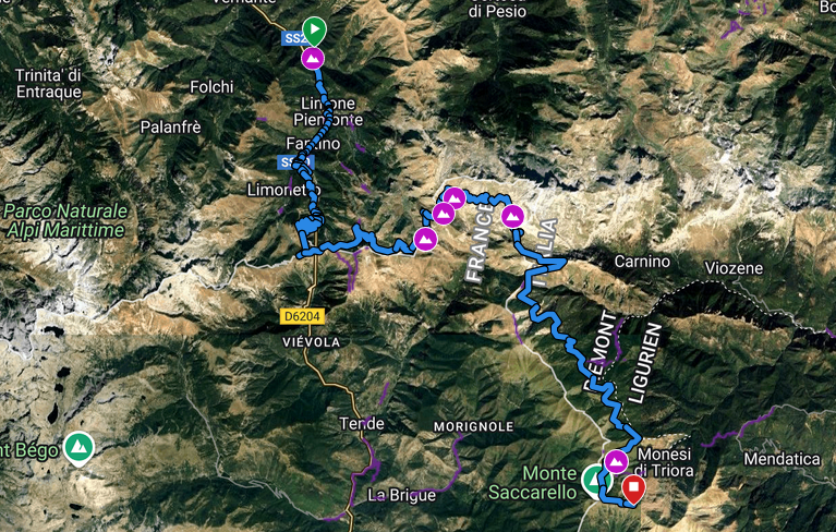Nach 35 Kilometern grobem Schotterweg erreichen wir die Gabelung unterhalb des Passo Tanarello. Noch einmal gilt es 300hm zu bewältigen! Wir klettern die Serpentinen hoch zum Monte Saccarello.